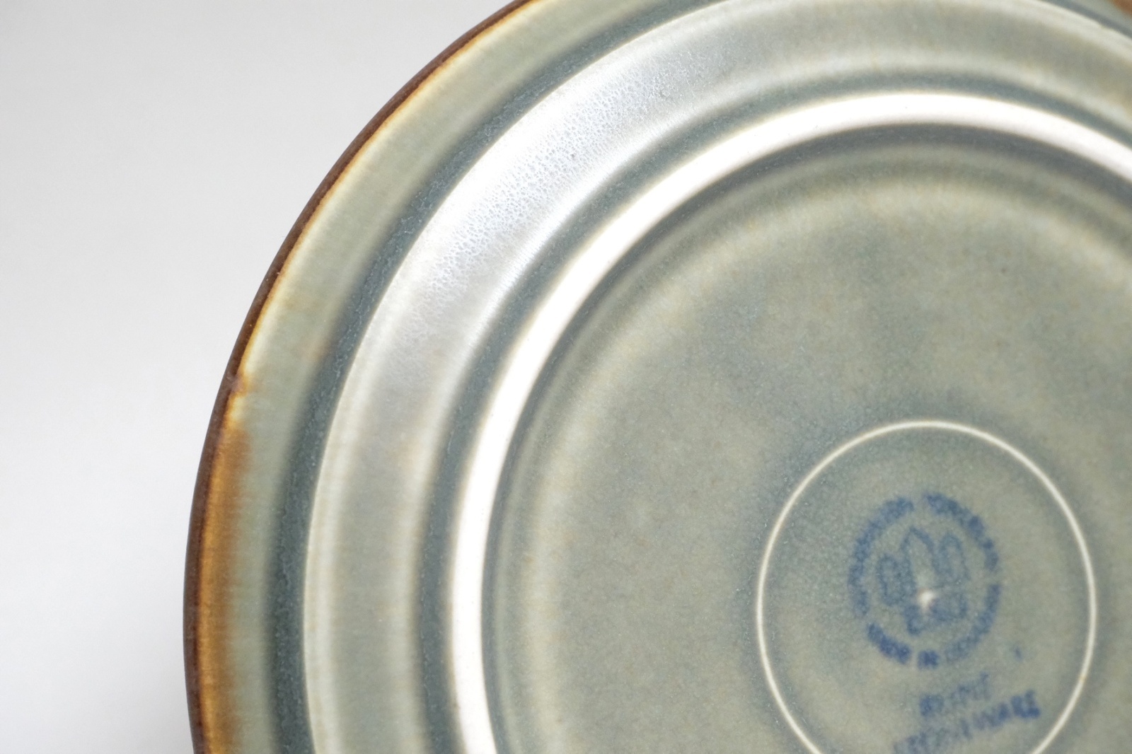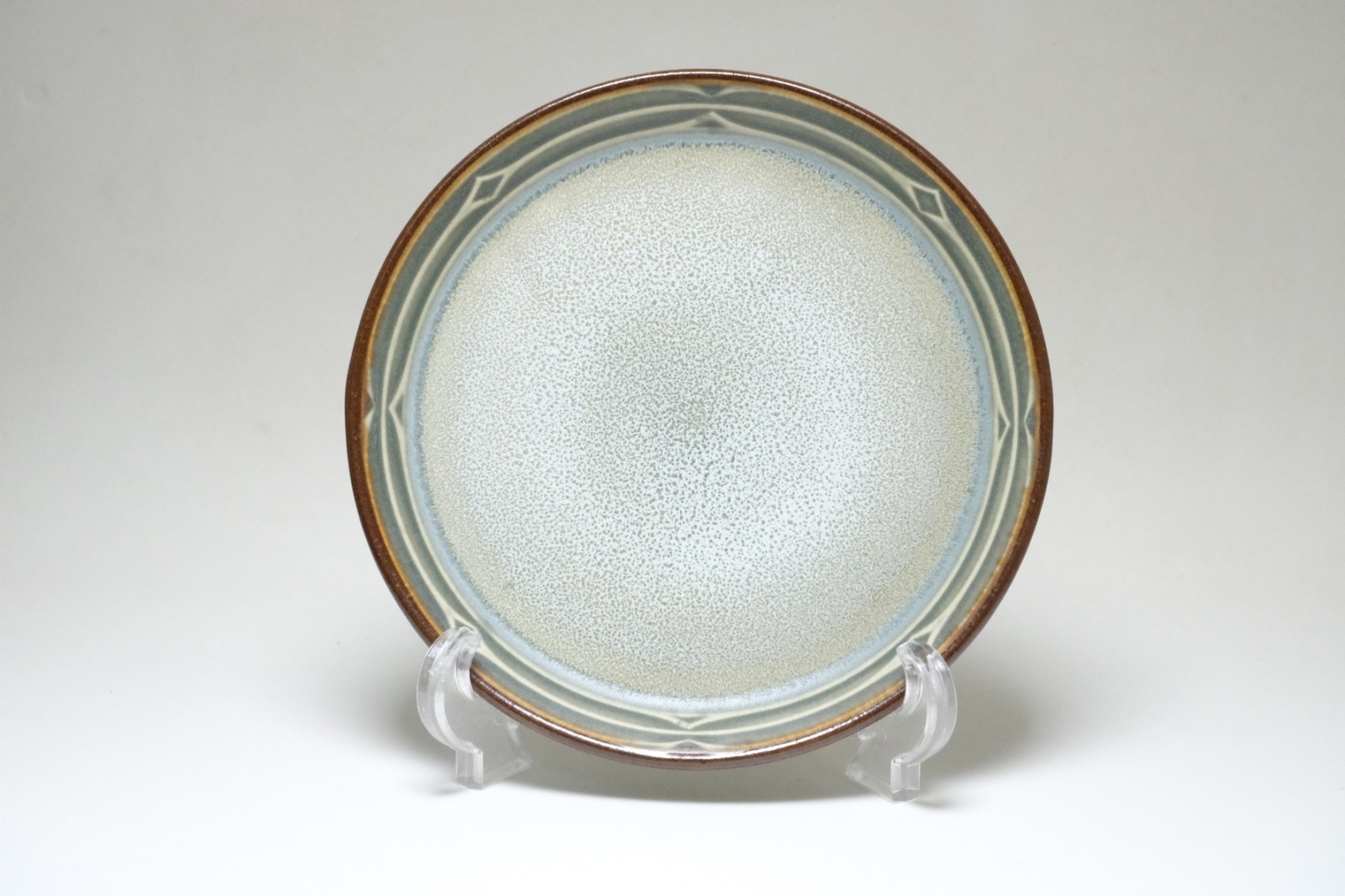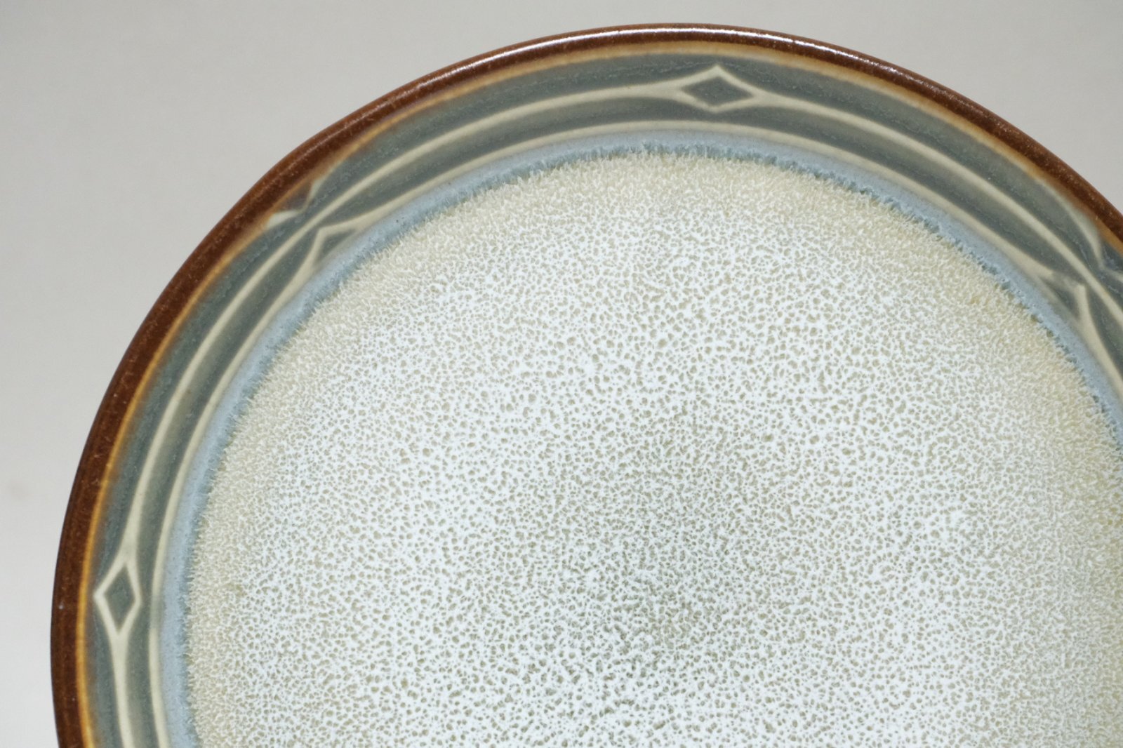 縁取りにオリーブカラーの落ち着いたカラーにベースにオリーブカラーに白の細かな点々の釉薬で深みを増しています。