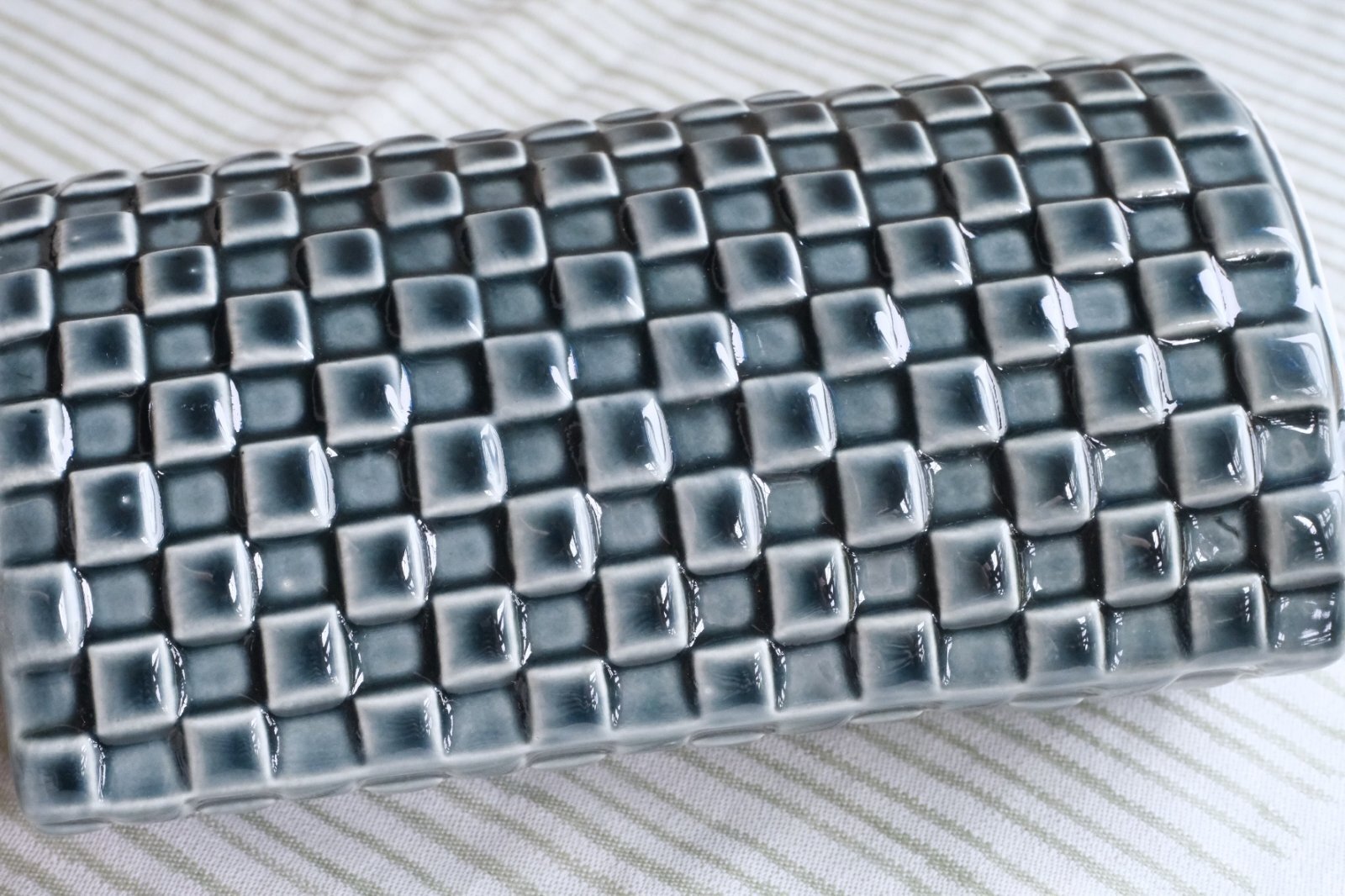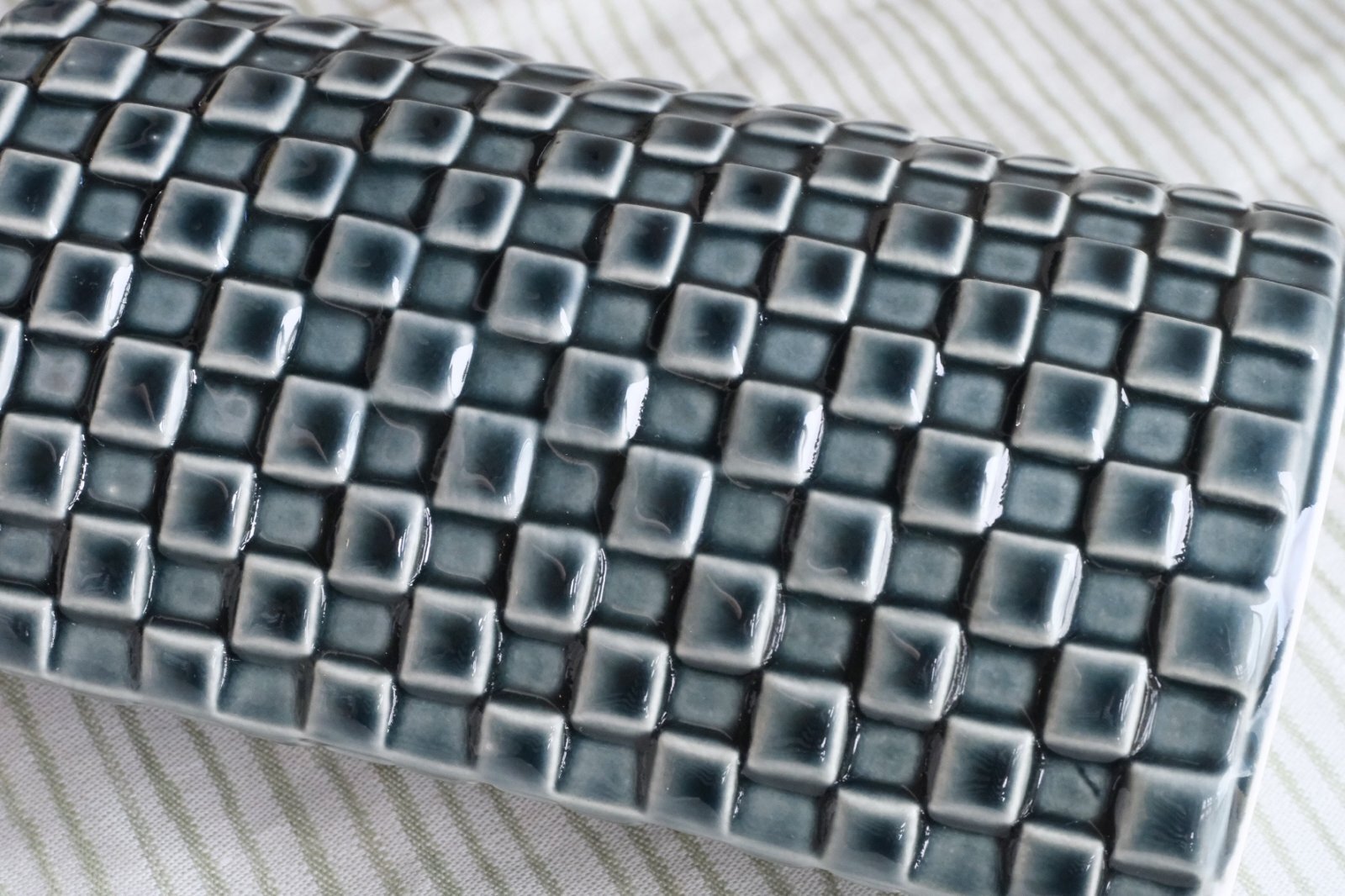 Kaarina Aho/カーリナ・アホによるデザインで葉の形をした楕円のフォルムに表面はダイヤ柄の凹凸のエンボスには釉薬の濃淡により表情を豊かにしています。