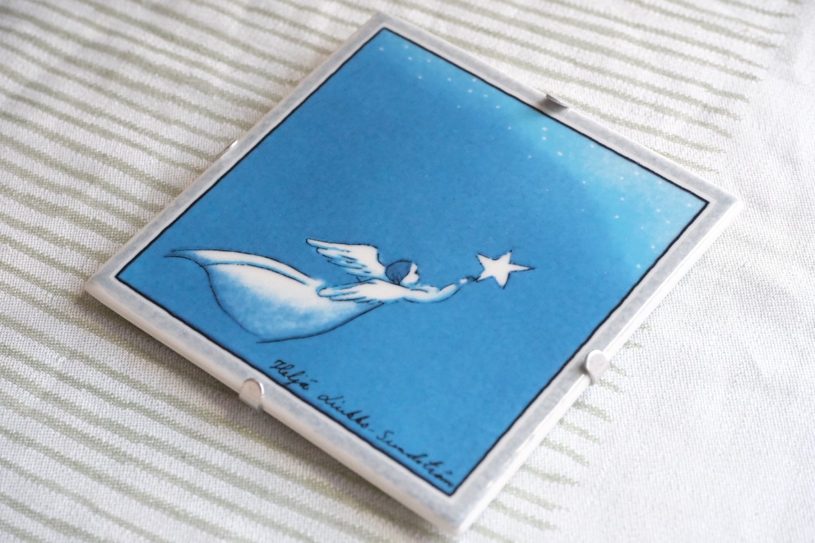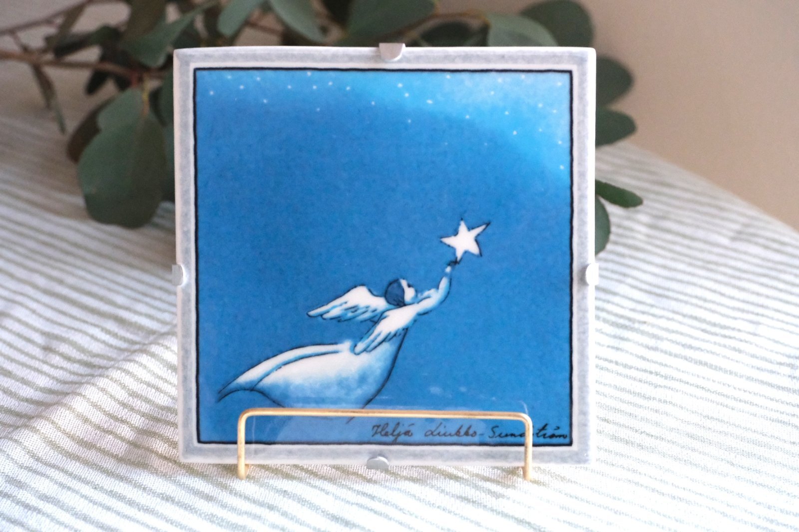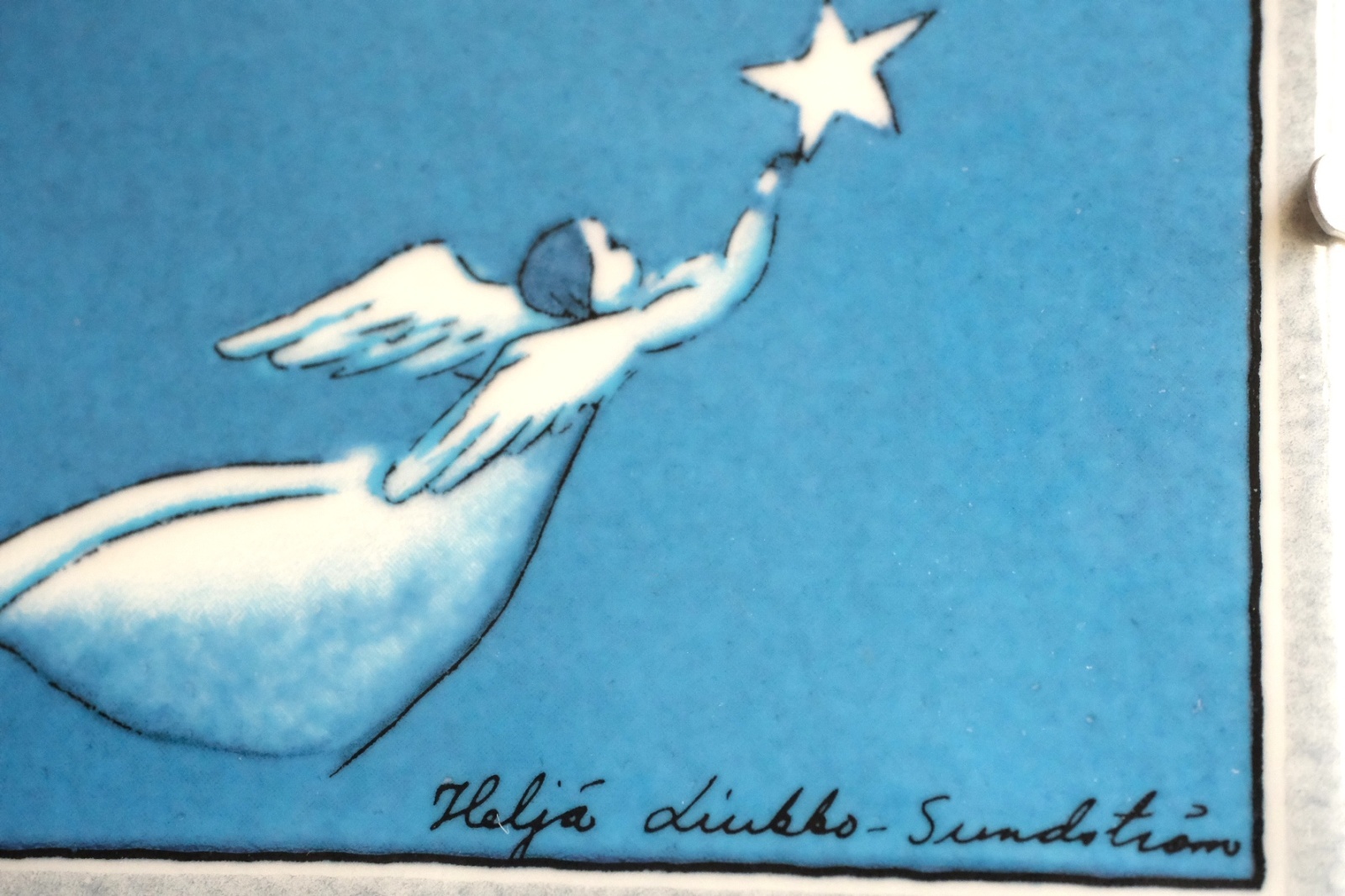 Enkeli lentaa/空を飛ぶ天使とタイトルがつけられたヘルヤの陶板です。