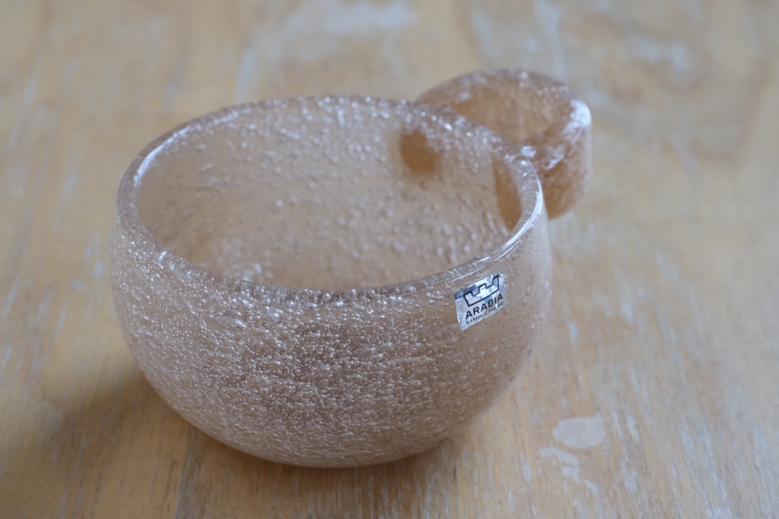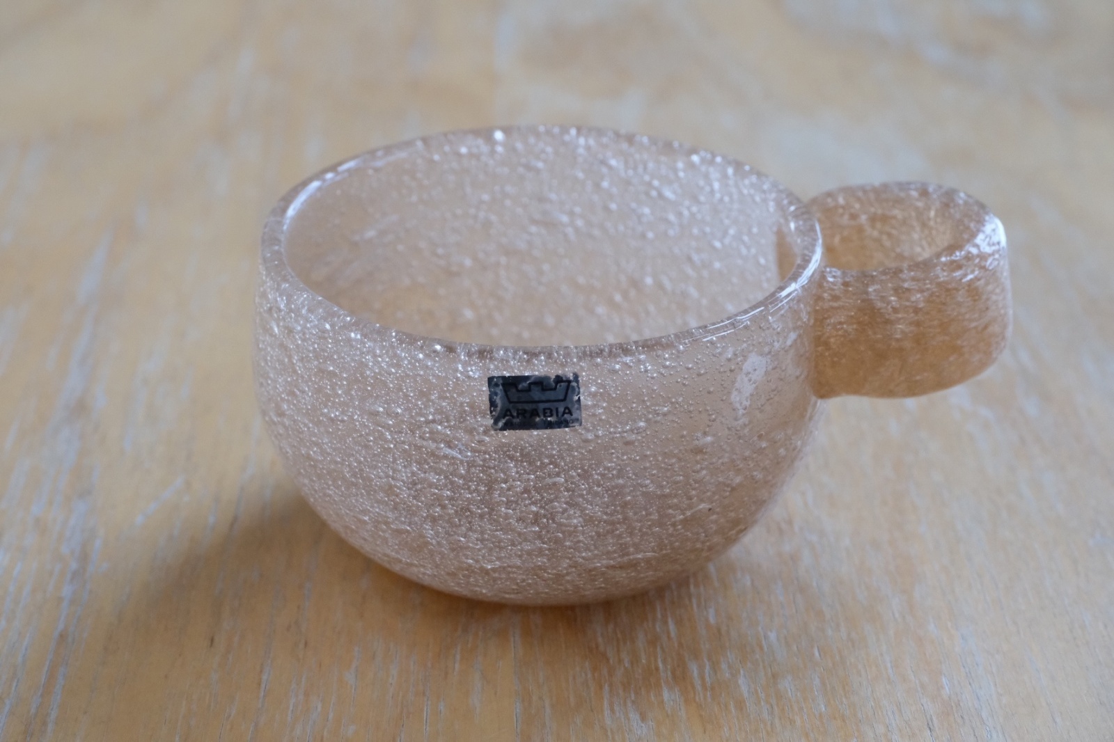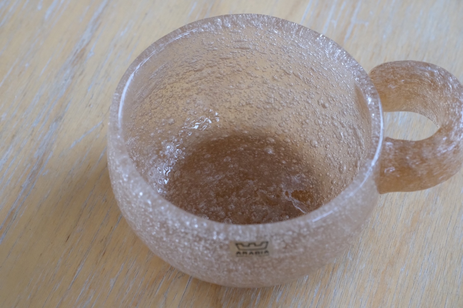 気泡のたくさん入ったガラスはとても素朴で力強さを感じます。カップを手のひらに包むとフィンランドのククサのような丸いフォルムでハンドルは親指で抑えて使いうデザインでククサのような愛しさを感じます。