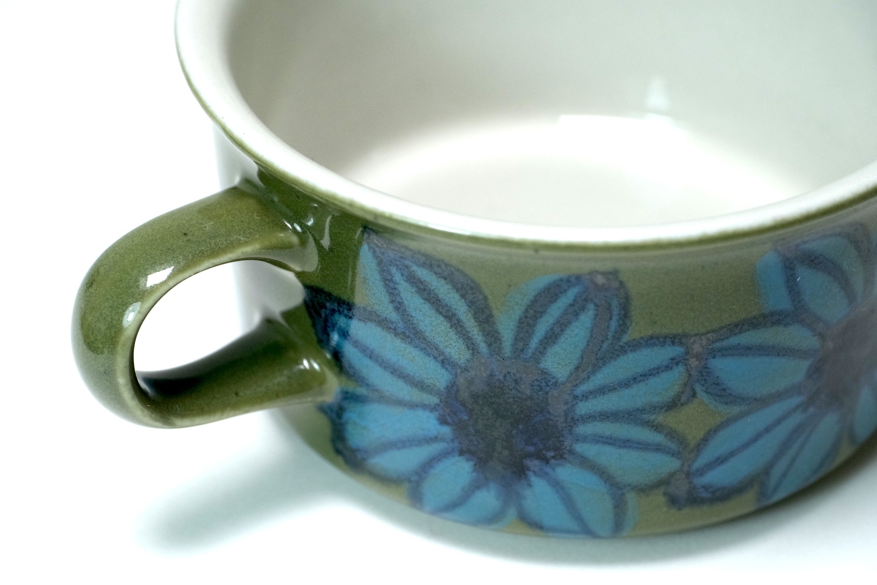 オリーブグリーンにブルーの花柄が新鮮なカラーリングです。