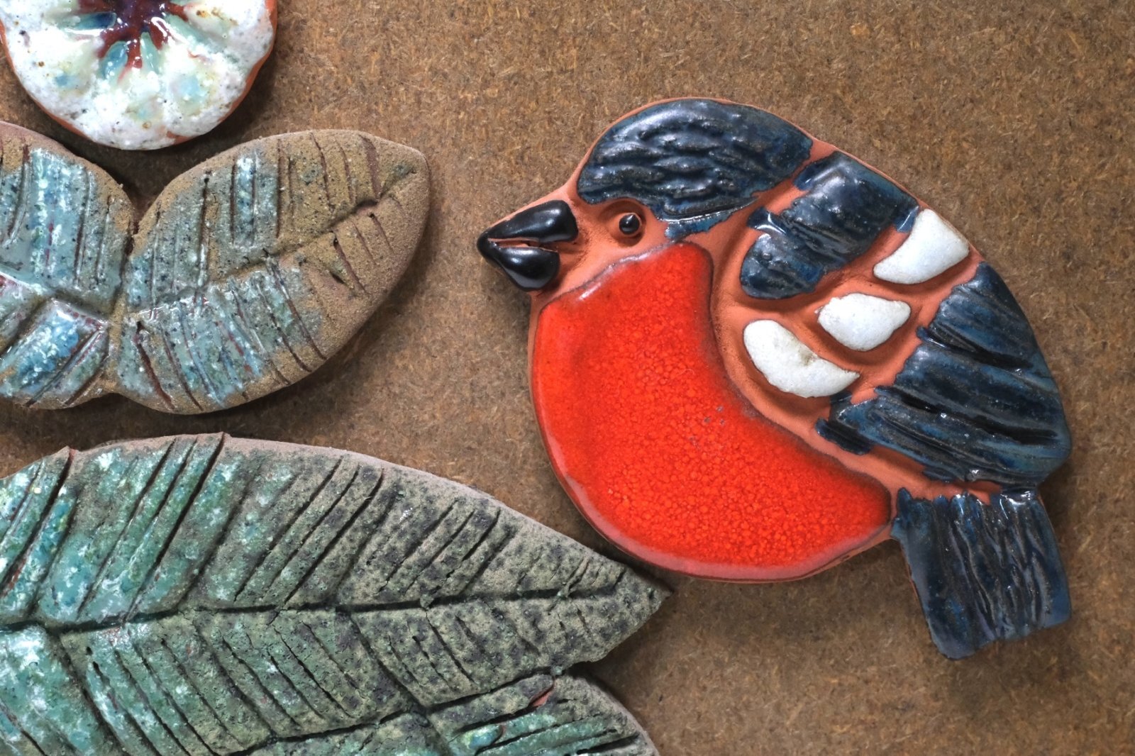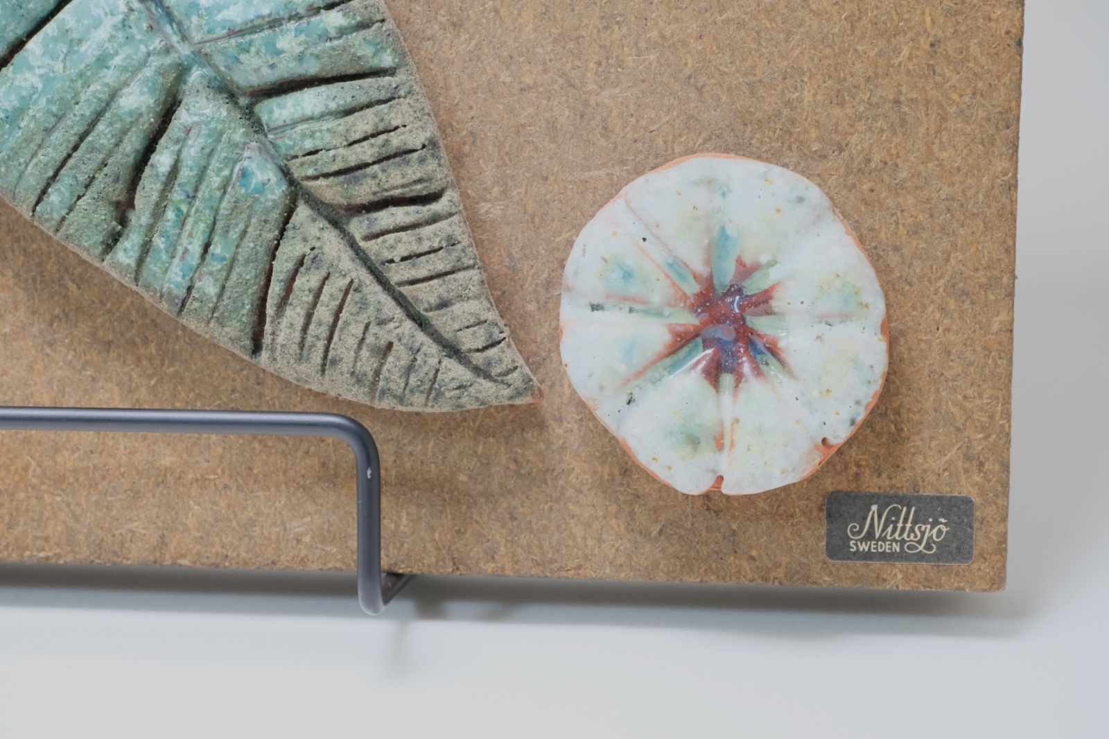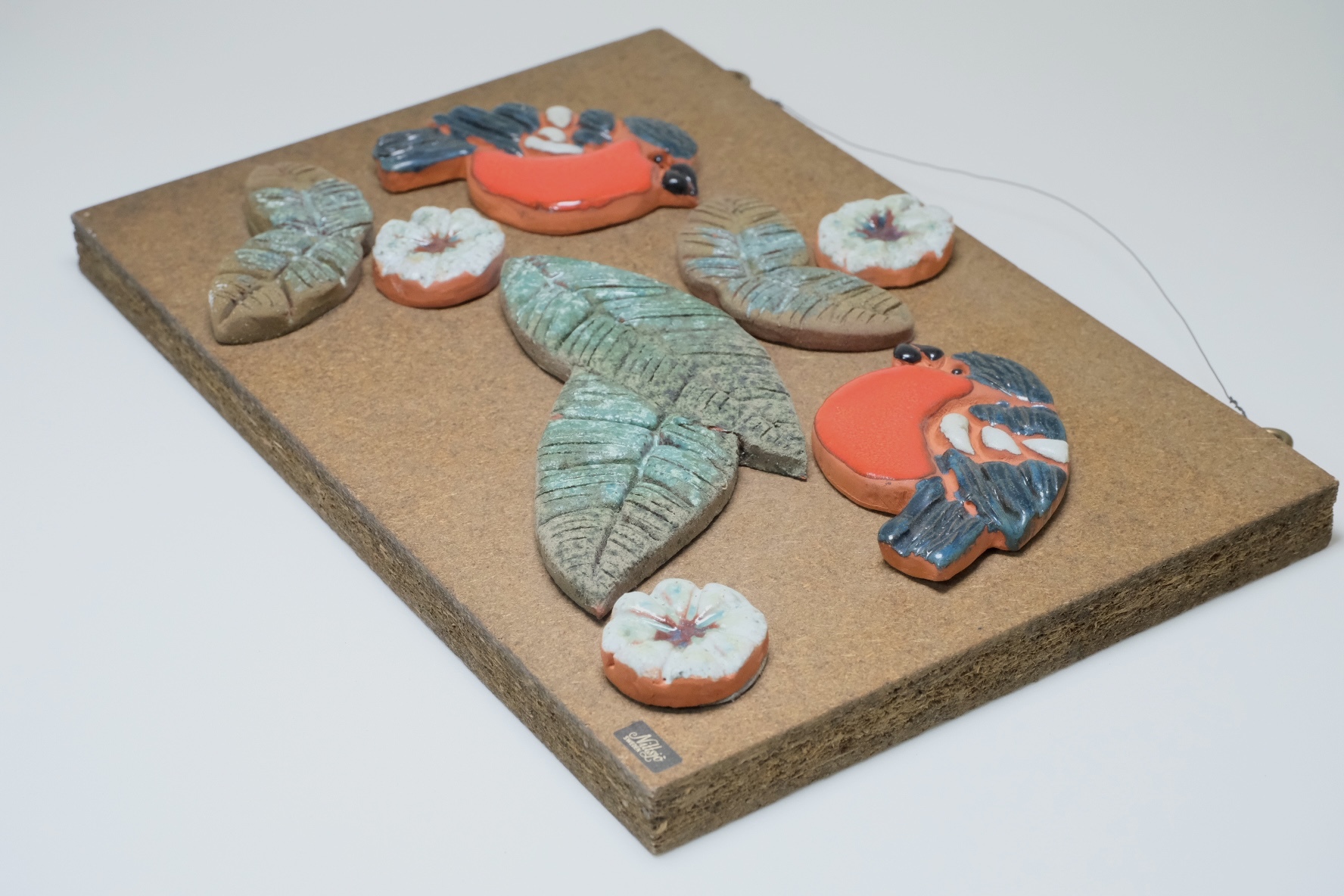 木のチップを圧縮したボードに陶製の小鳥や葉、花のピースが付けられています。