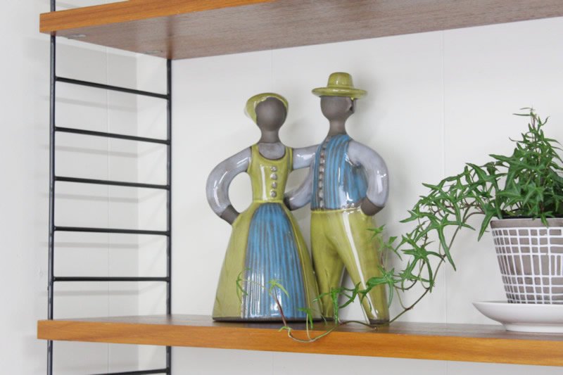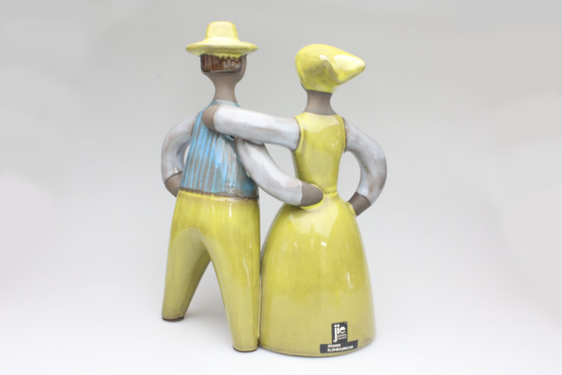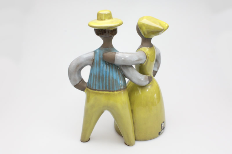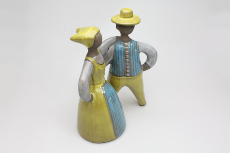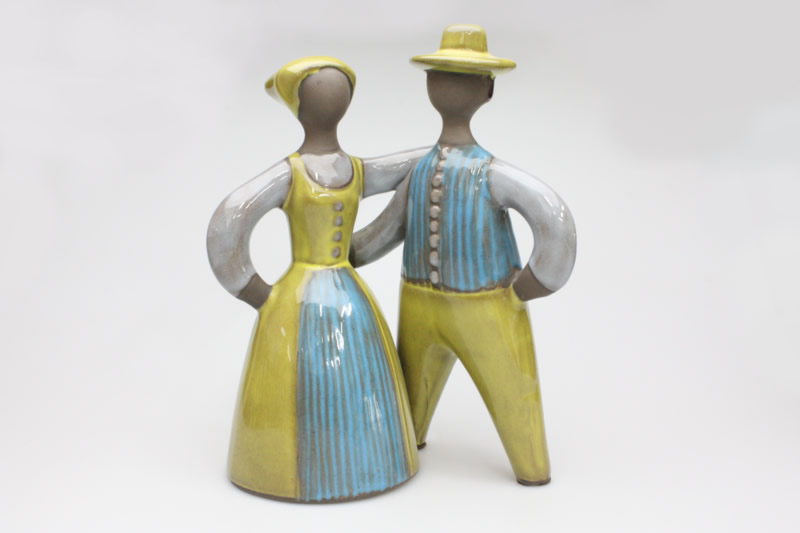 まるでダンスをしている様な北欧の民族衣装をまとった2人のフィギュアです。スウェーデンのJie gantofta社製。デザイナーはElsi Bourelius、彼女は日常生活のフィギュアを得意として多くの作品を生み出しました。こちらの商品は彼女の代表的なデザインです。衣装には艶やかな釉薬がかかり、顔や手は素焼きをいかしています。ダメージなしの良好なコンディションです。